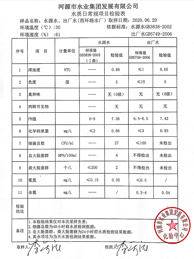2020年6月29日水質(zhì)檢驗報告