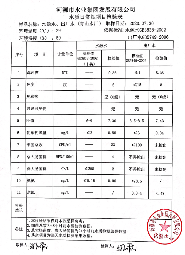 2020年7月30日水質(zhì)檢驗(yàn)報告