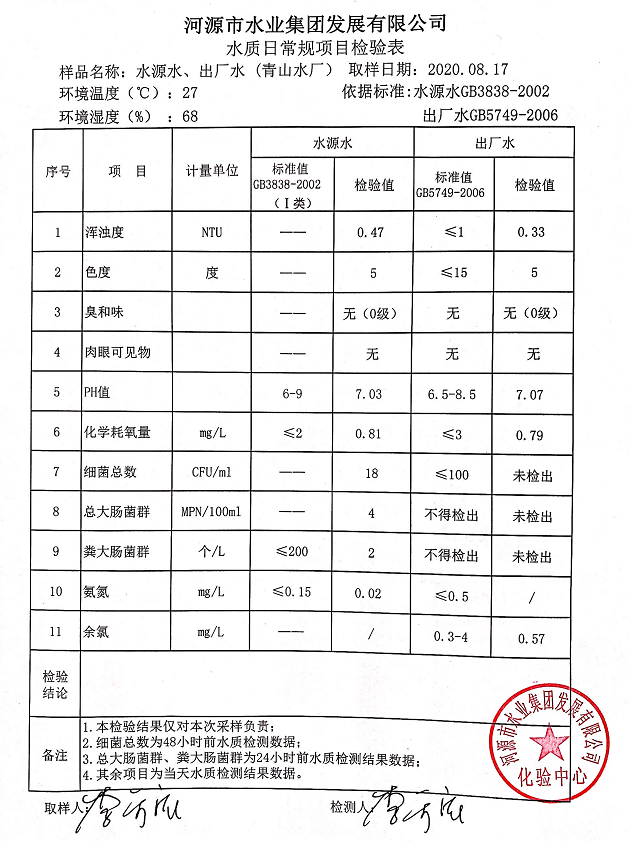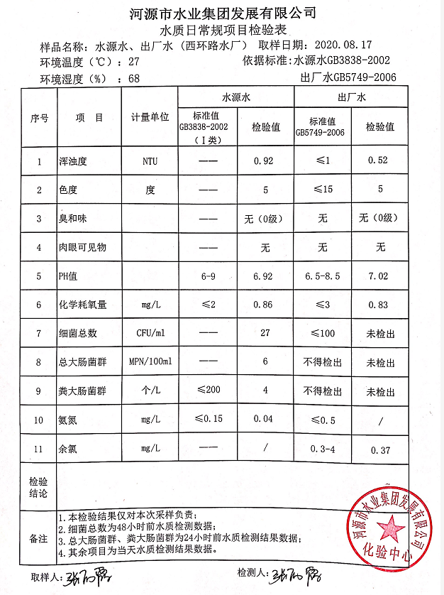 2020年8月17日水質檢驗報告