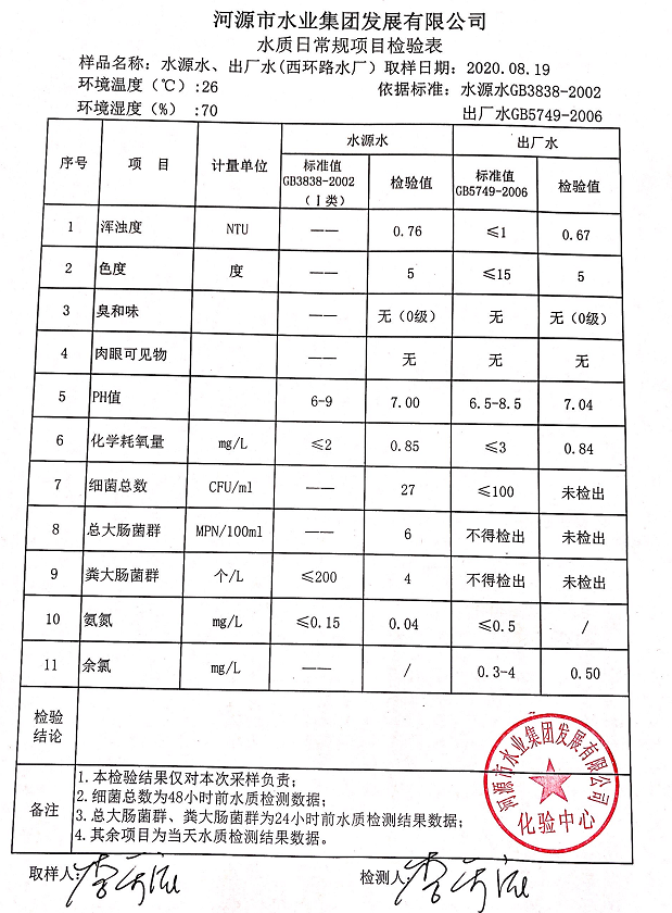 2020年8月19日水質(zhì)檢驗報告
