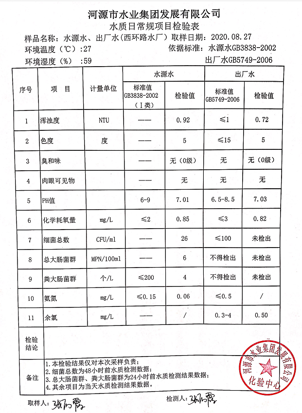 2020年8月27日水質(zhì)檢驗(yàn)報(bào)告