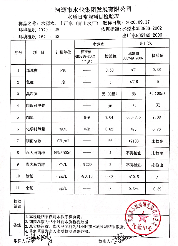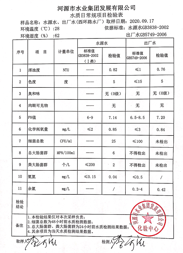 2020年9月17日水質(zhì)檢驗報告