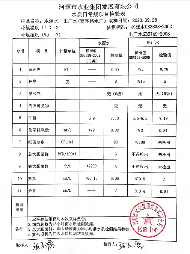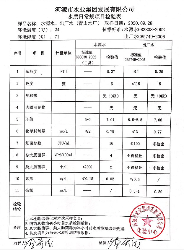 2020年9月28日水質(zhì)檢驗報告