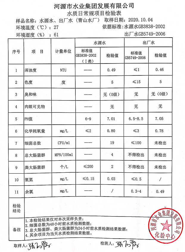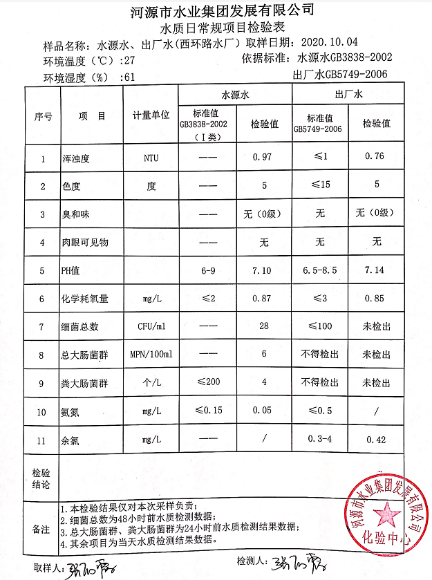 2020年10月4日水質(zhì)檢驗報告