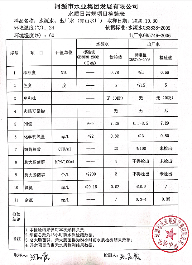 2020年10月30日水質檢驗報告