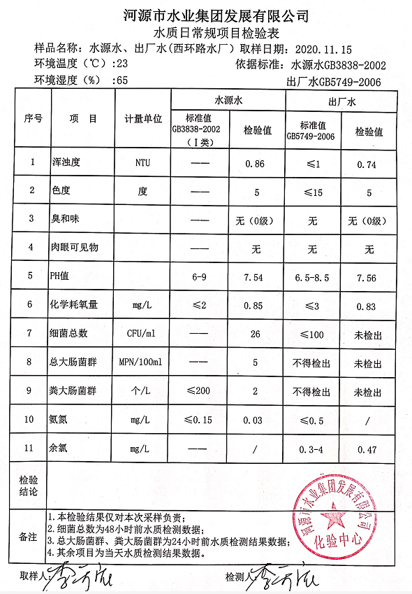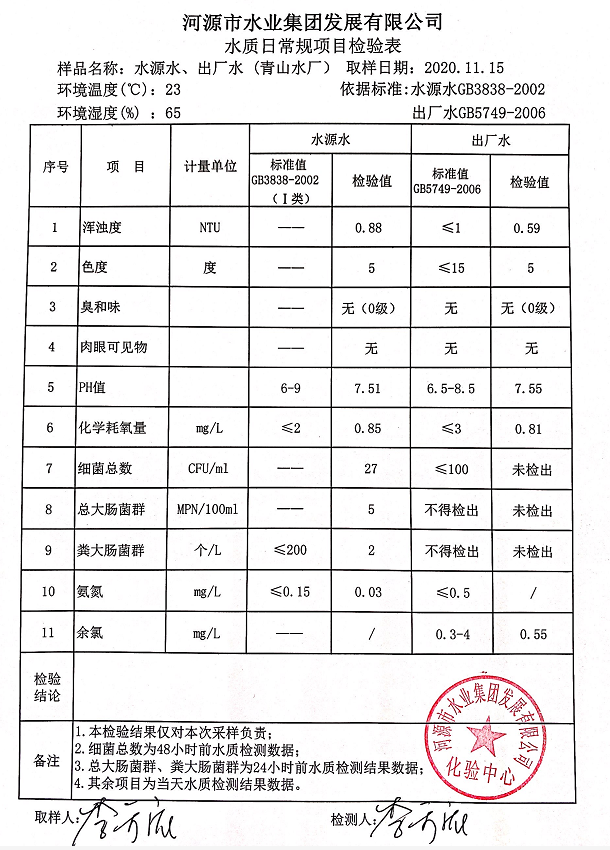 2020年11月15日水質(zhì)檢驗(yàn)報(bào)告