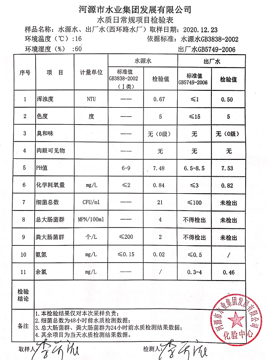 2020年12月23日水質(zhì)檢驗(yàn)報告