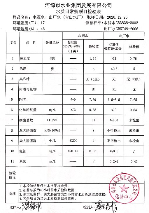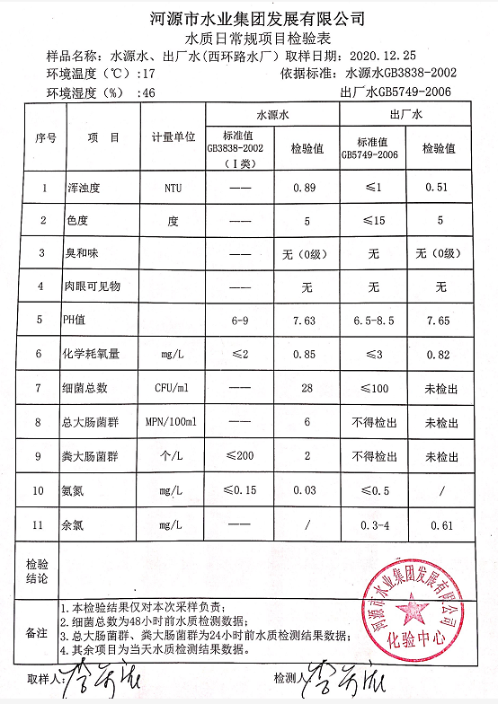 2020年12月25日水質(zhì)檢驗報告