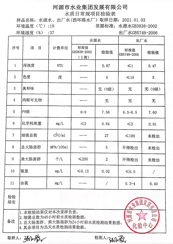 2021年1月3日水質(zhì)檢驗報告