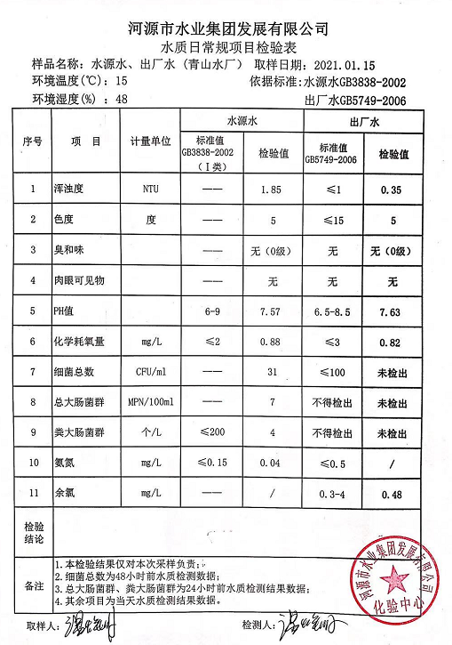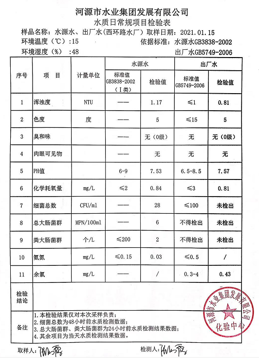 2021年1月15日水質檢驗報告