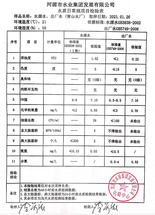 2021年1月26日水質(zhì)檢驗報告