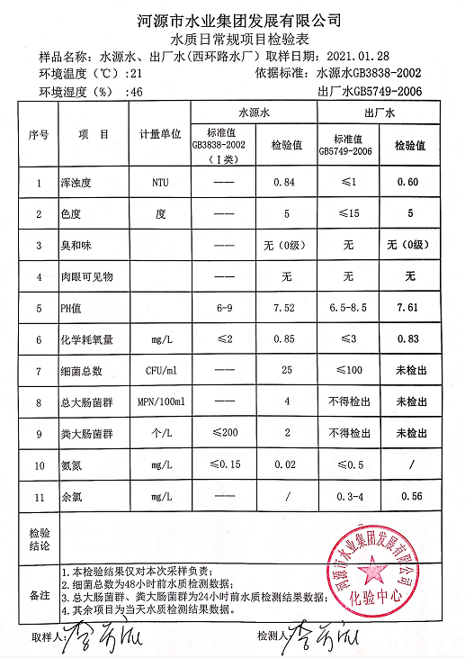 2021年1月28日水質(zhì)檢驗報告
