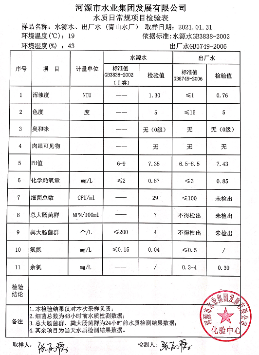 2021年1月31日水質(zhì)檢驗(yàn)報告