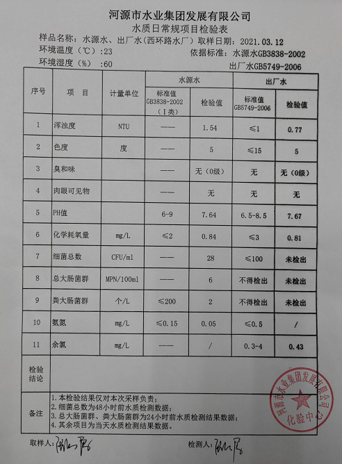 2021年3月12日水質(zhì)檢驗(yàn)報告