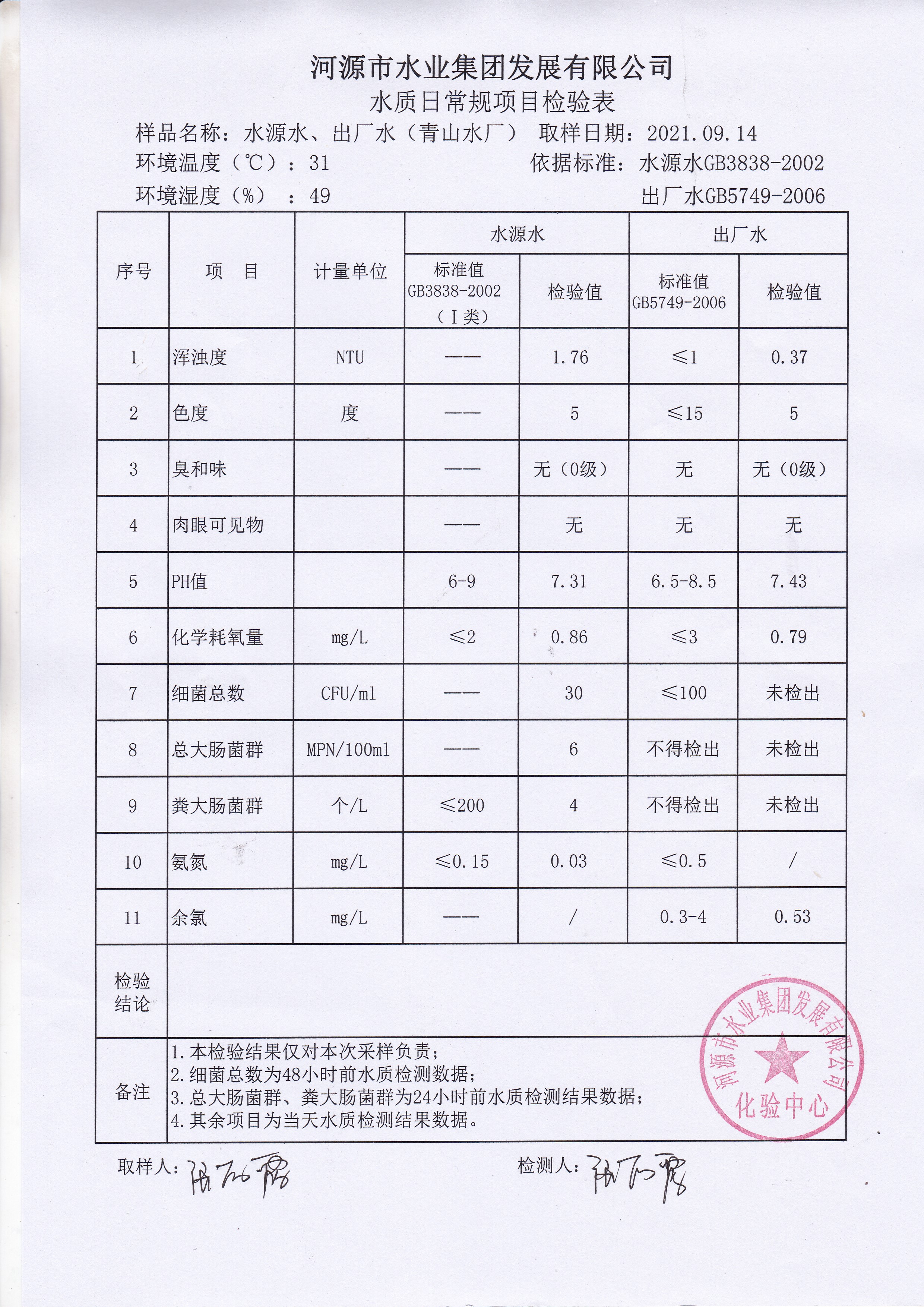 2021年9月14日水質(zhì)檢驗報告 ??