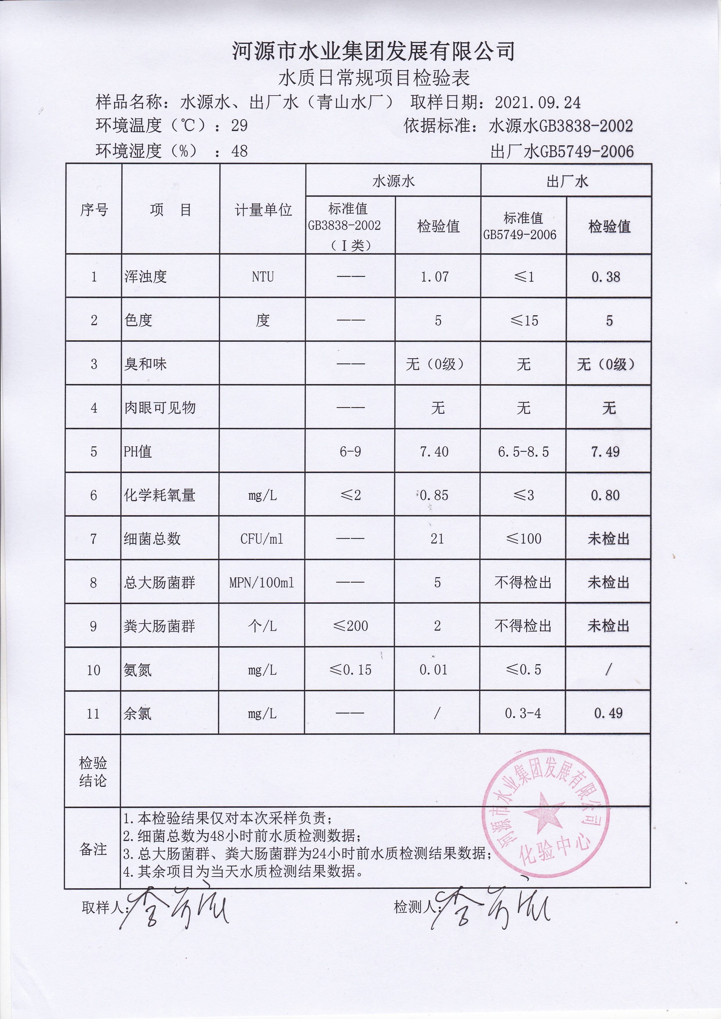 2021年9月24日水質(zhì)檢驗(yàn)報(bào)告