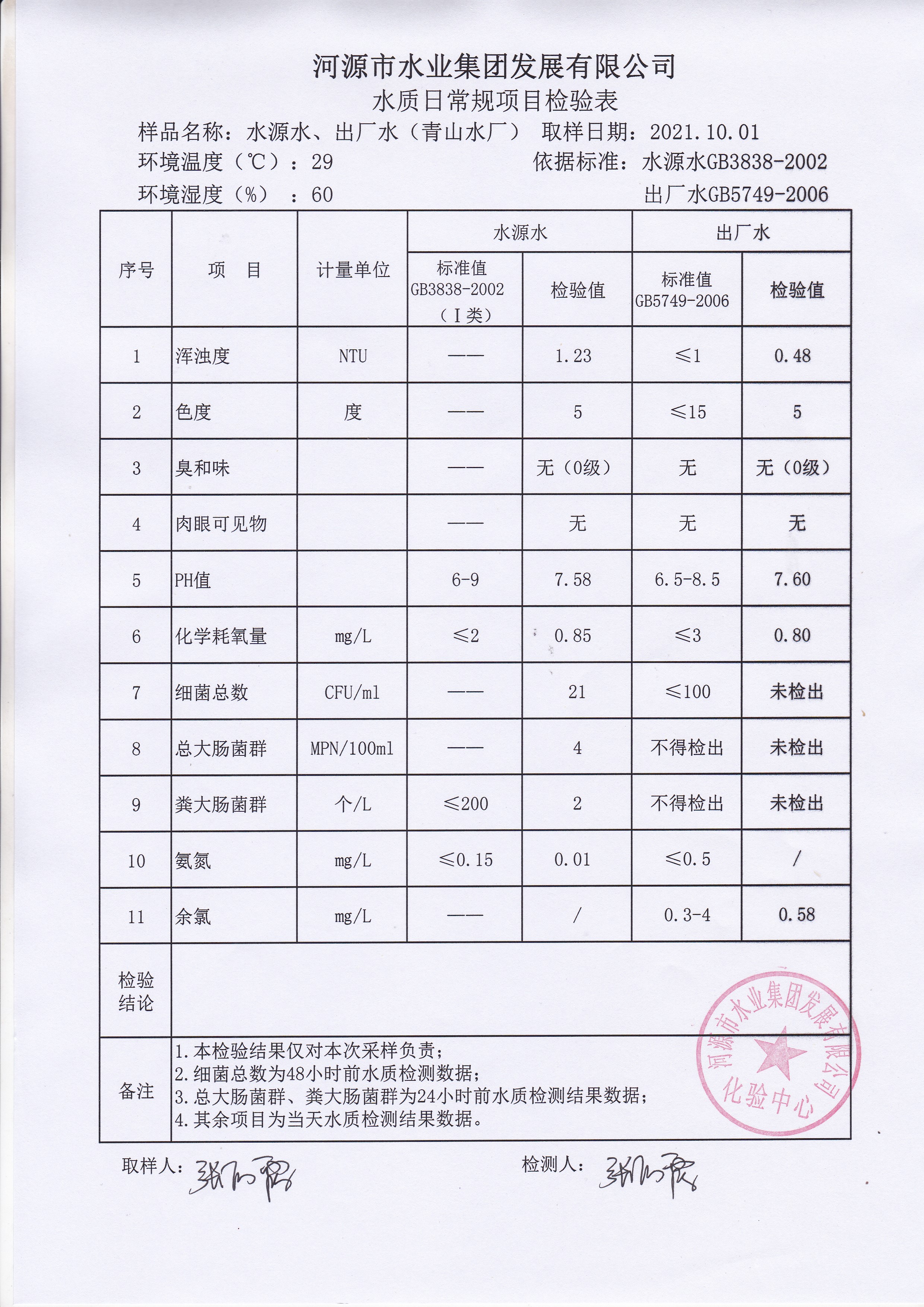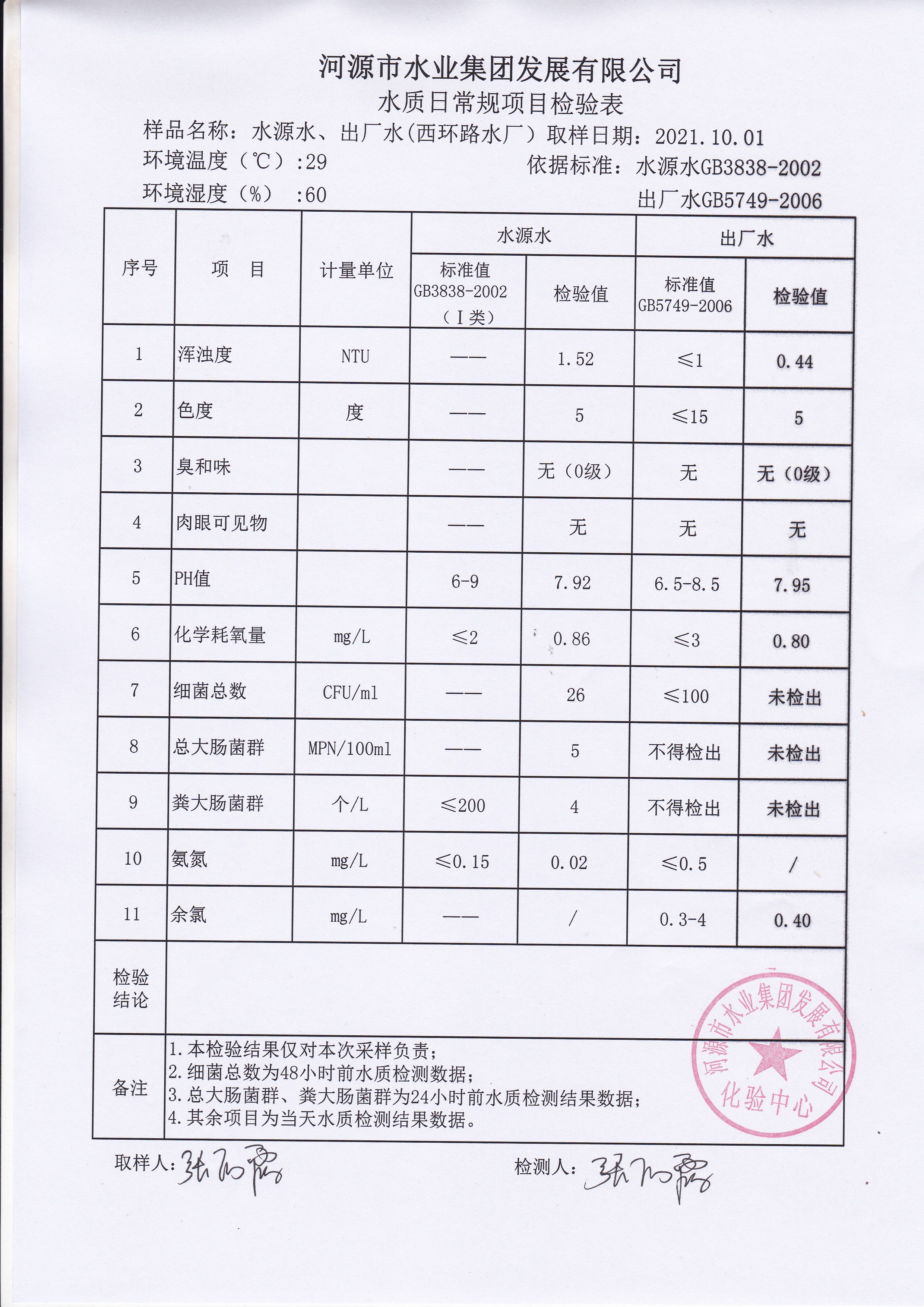 2021年10月1日水質(zhì)檢驗(yàn)報(bào)告