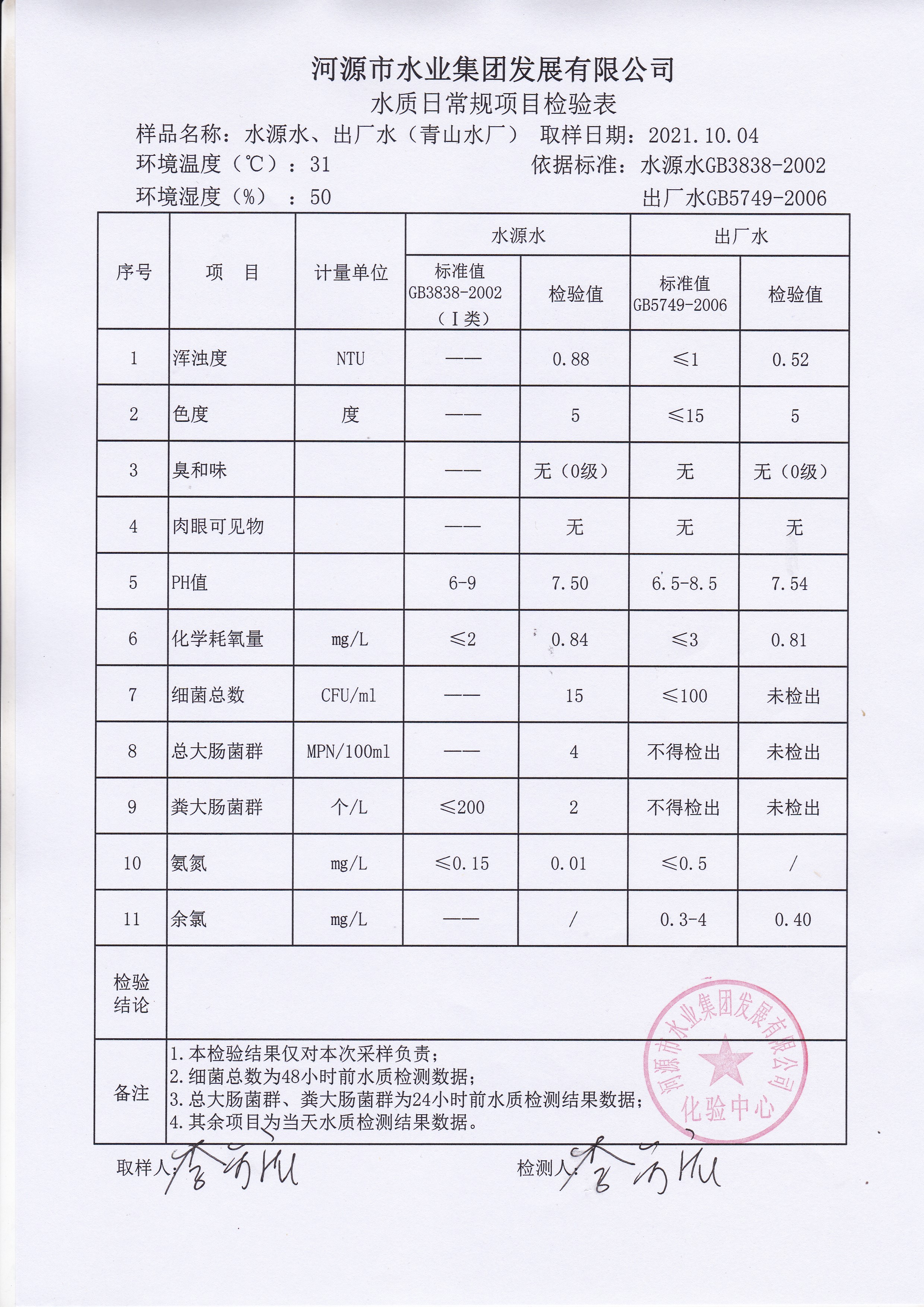 2021年10月4日水質(zhì)檢驗報告