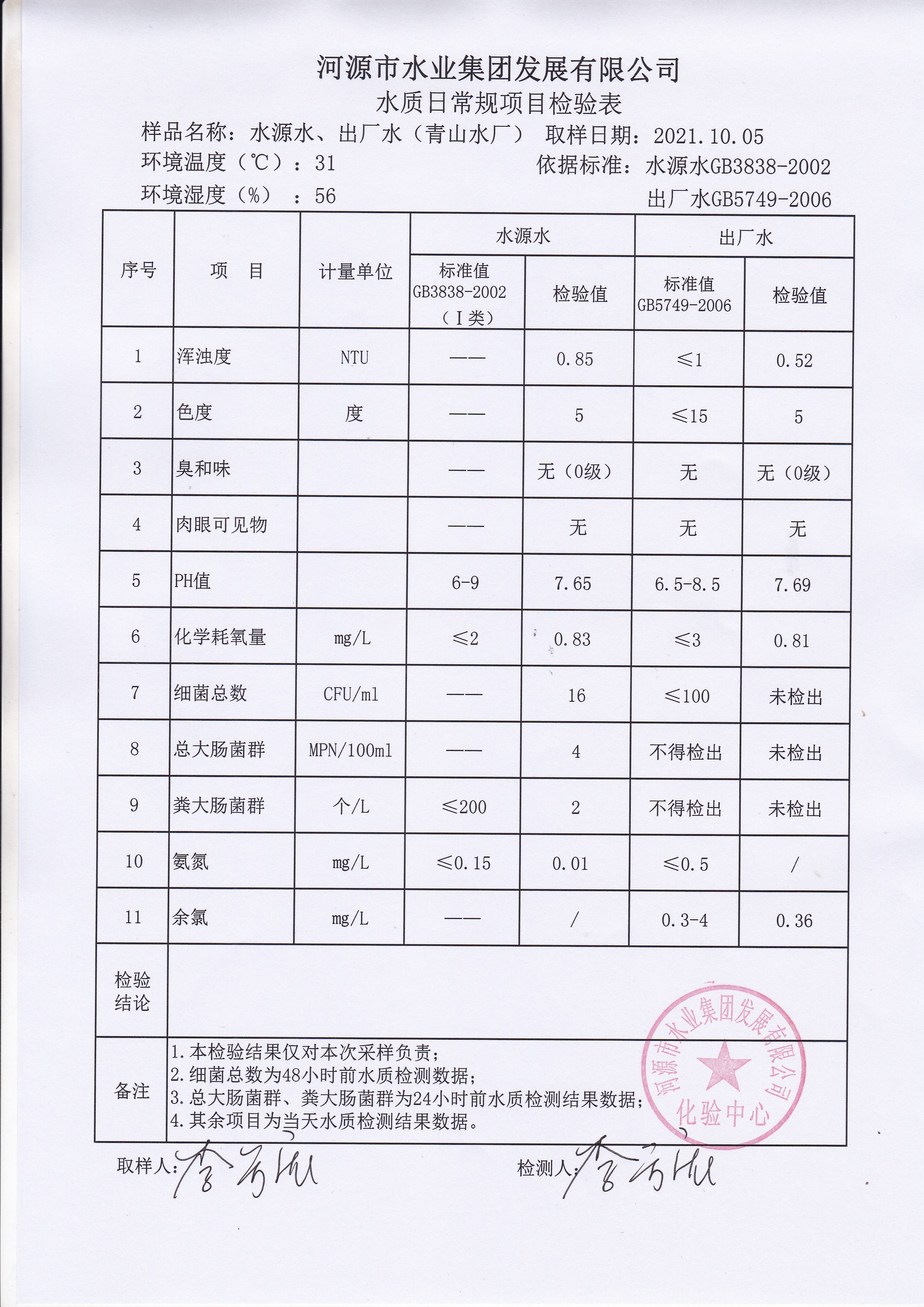 2021年10月5日水質(zhì)檢驗報告