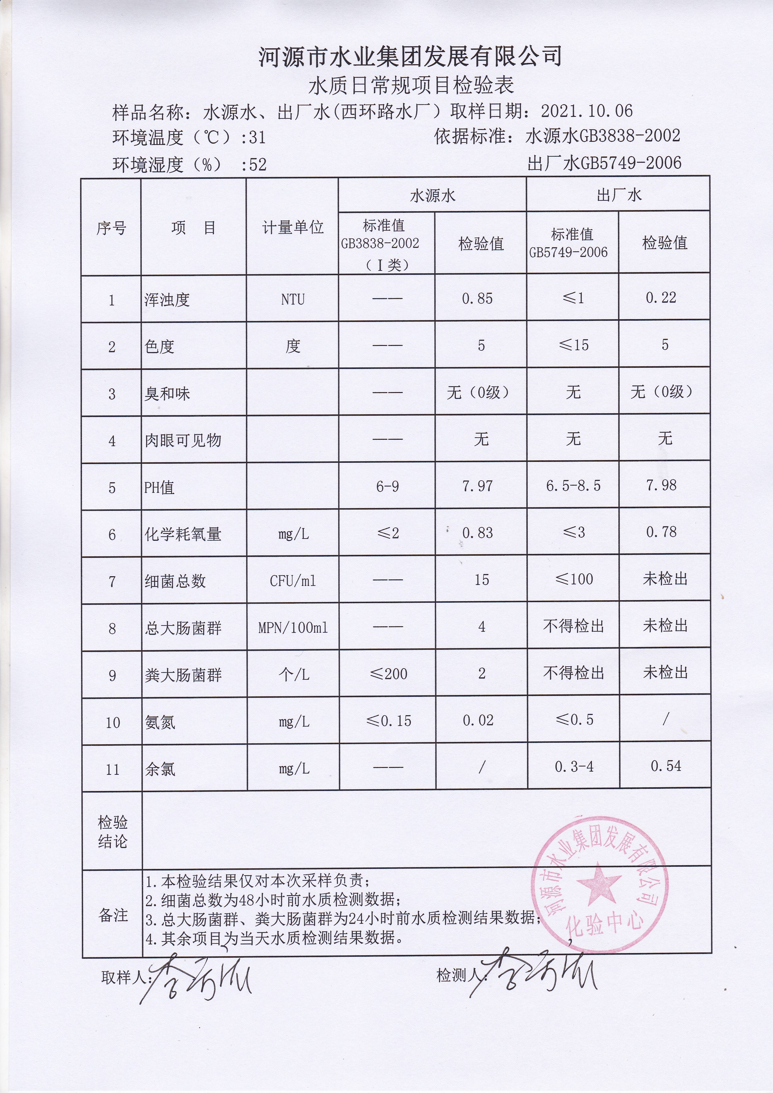2021年10月6日水質(zhì)檢驗報告