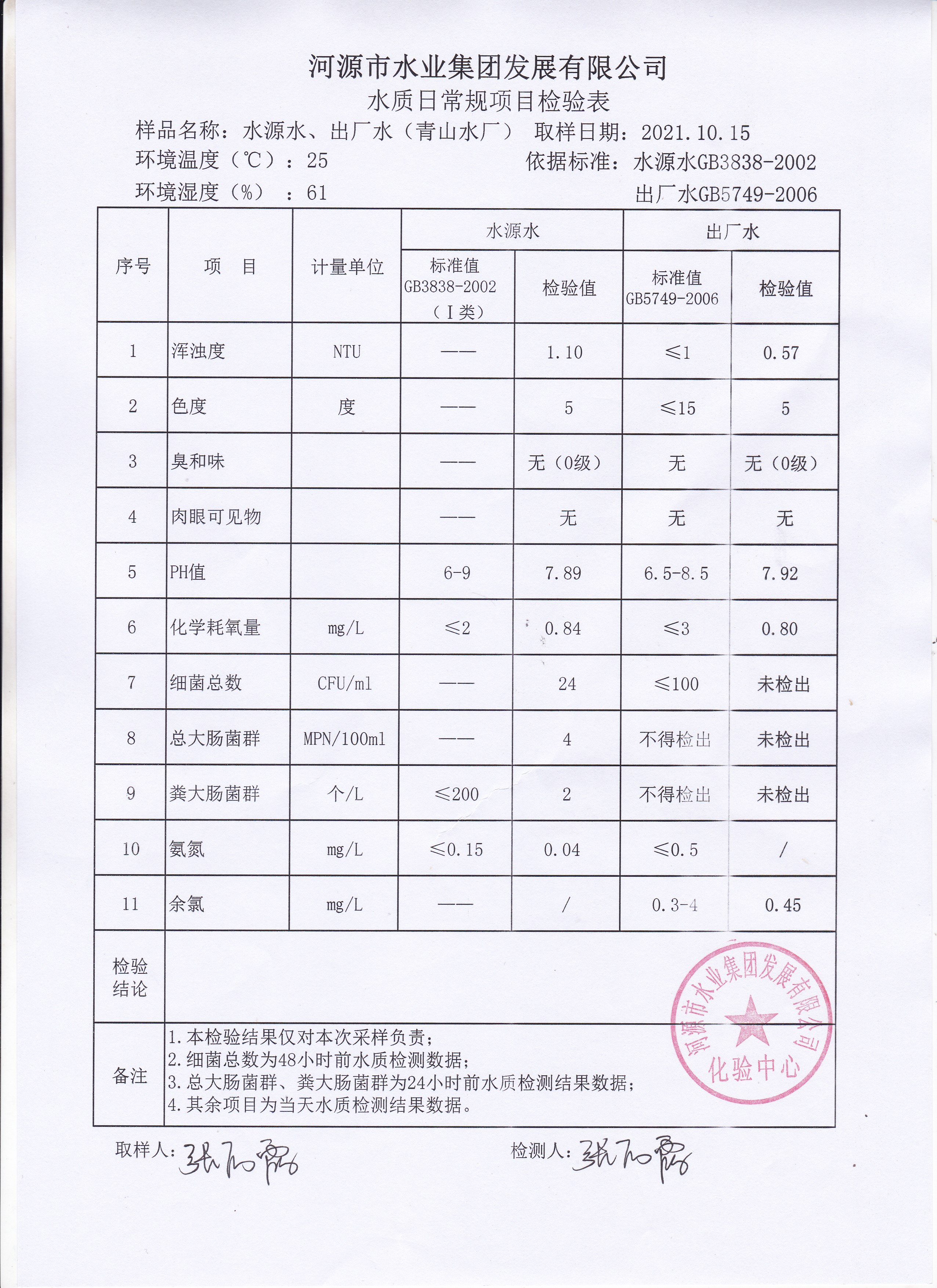 2021年10月15日水質(zhì)檢驗(yàn)報(bào)告