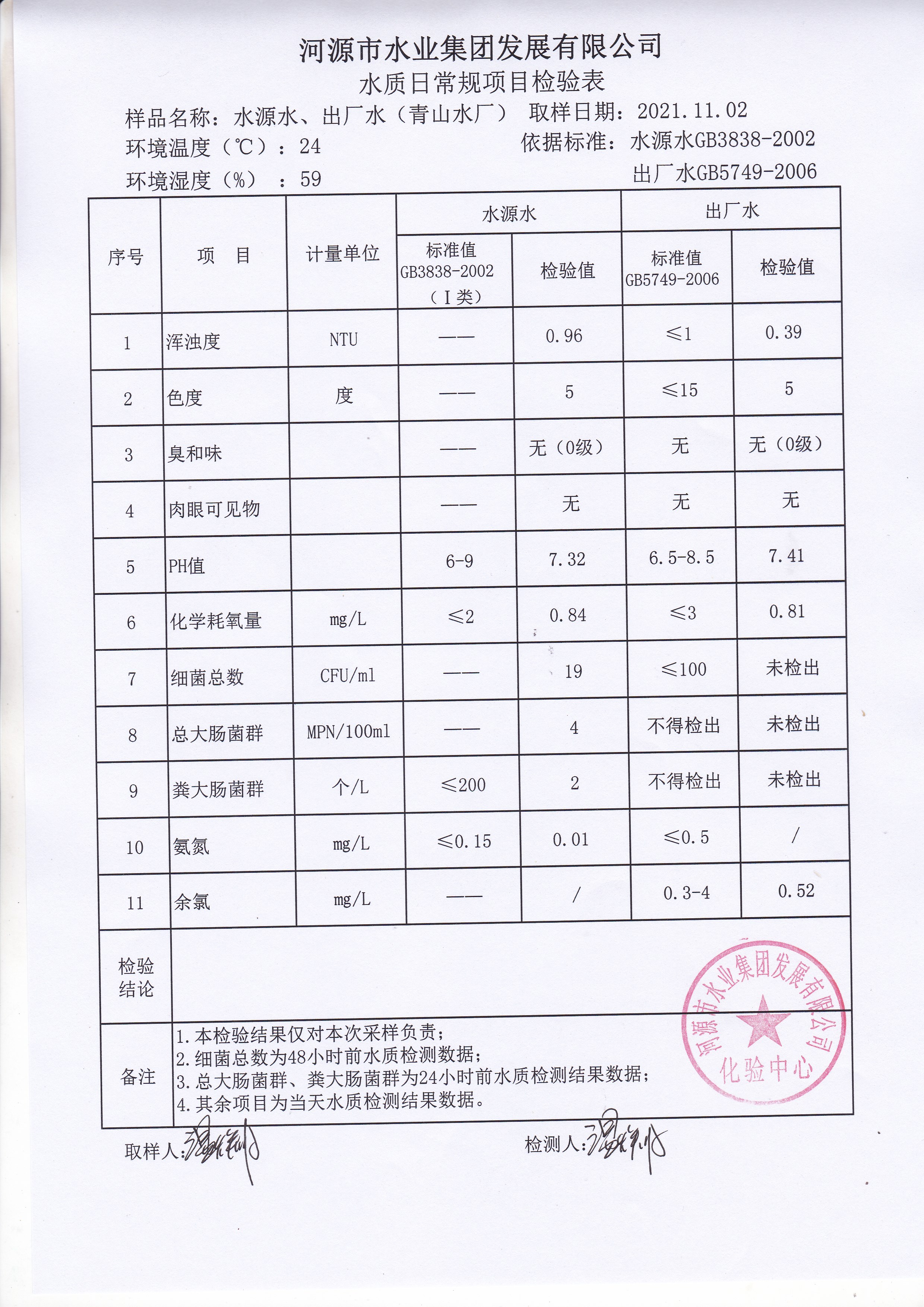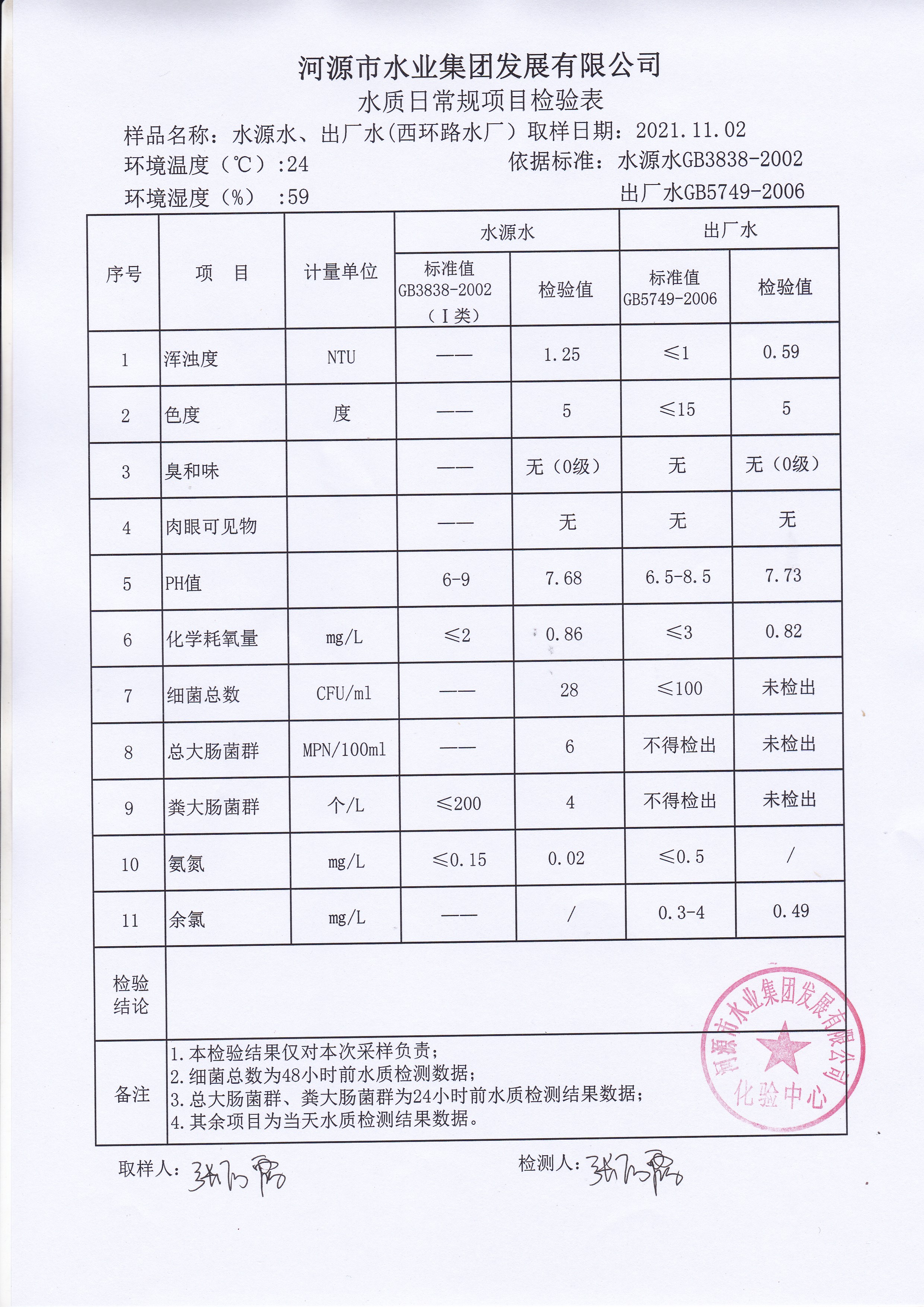 2021年11月2日水質(zhì)檢驗報告