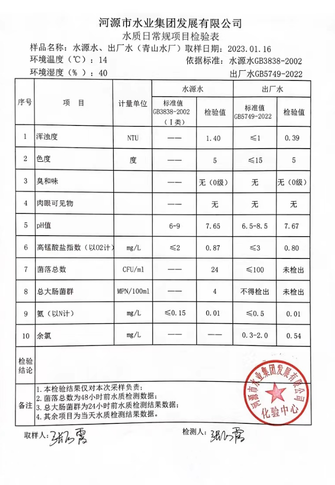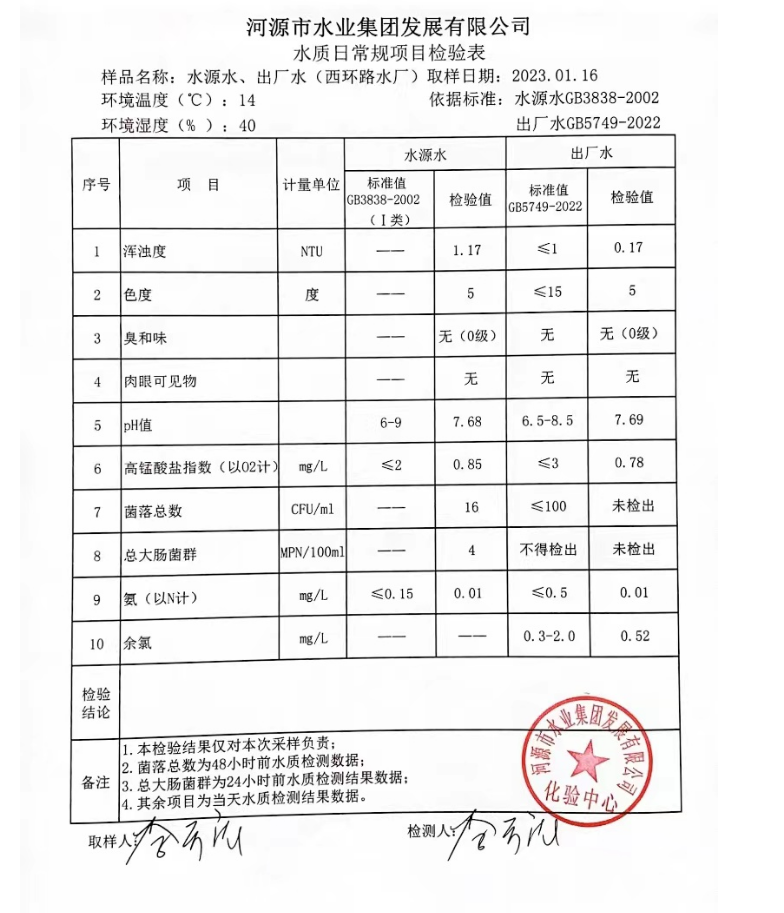 2023年1月16日水質(zhì)檢驗(yàn)報(bào)告