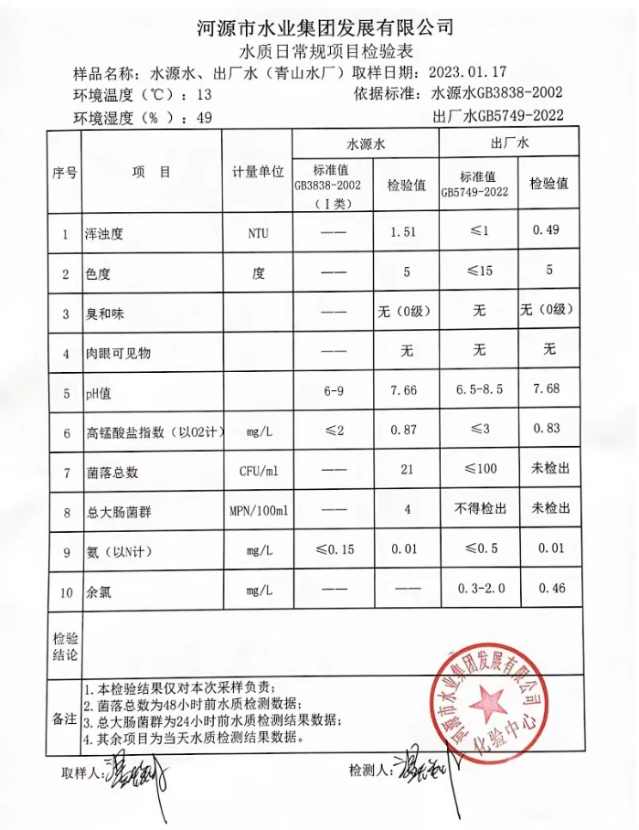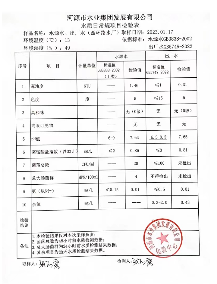 2023年1月17日水質(zhì)檢驗(yàn)報告