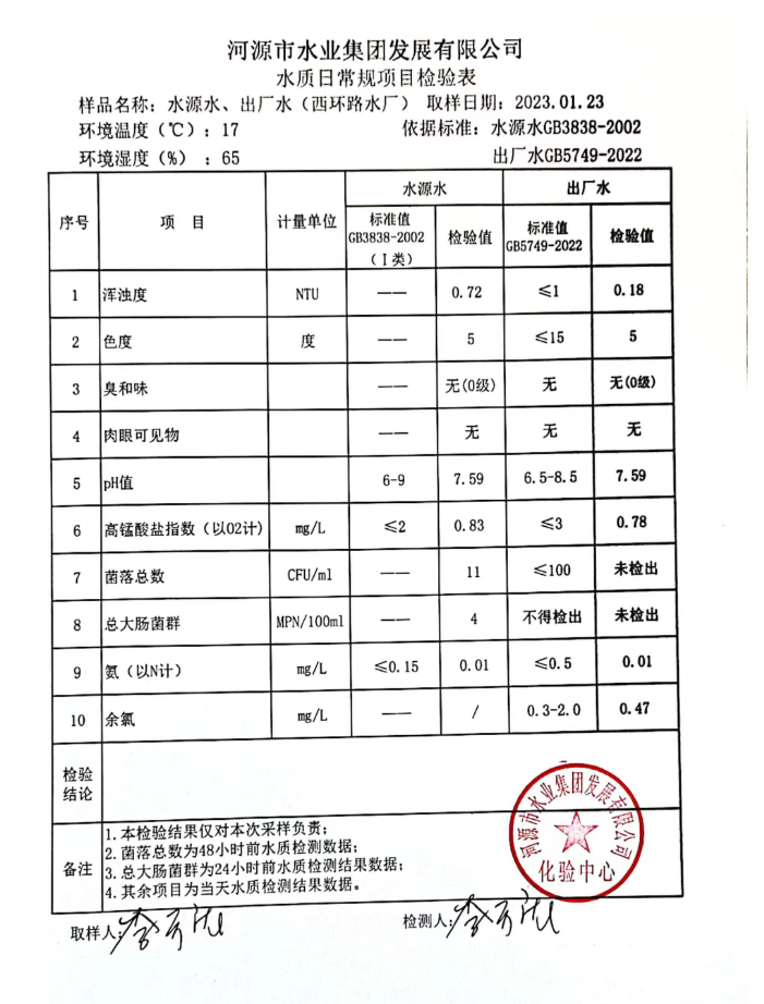 2023年1月23日水質(zhì)檢驗(yàn)報(bào)告