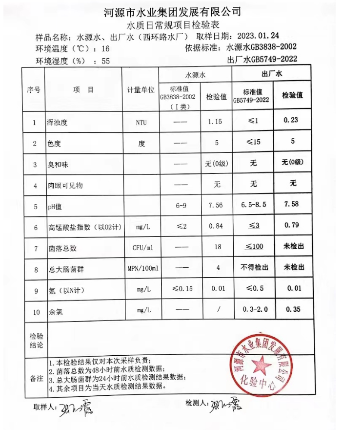 2023年1月24日水質(zhì)檢驗報告